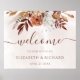 Modernes böhmisches Begrüßungszeichen mit Aquarellfarben, Blume und Herbstlauben in Erdtönen wie Rostbraun, Bronzeorange und Terrakotta. Perfekte Wahl für Herbsthochzeiten.
