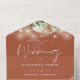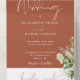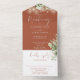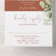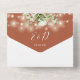 Alles in einer Terracotta Hochzeitseinladung mit hübschen Saitenlichtern, Blumengrün und eleganter Typografie. Die Einladung enthält eine perforierte RSVP-Karte, die für Sie individuell adressiert oder links als leere Karte für die Handschrift der Adressdaten Ihres Gastes verwendet werden kann. Entwickelt von Thisisnotme©