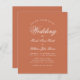 Eine einfache, minimalistische Budget Hochzeitseinladung. Es hat nur weißen Text auf Terrakotta Hintergrund. Das Wort Hochzeit und die Namen sind in einem eleganten kalligrafischen Skript geschrieben. Terracotta ist eine rötlich-braune, moderne, natürliche, erdige Farbe.