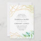 Unsere Terrariensammlung umrahmt Ihre Hochzeitsdetails mit einem faszinierenden Rahmen von geometrischen, goldenen Elementen, hervorgehoben durch üppig wasserfarbene botanische Blätter unten rechts. Hochzeitseinladungen kehren zu einem Aquarellspülmuster in Pastelltönen in Blau und Grün zurück.