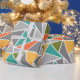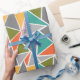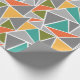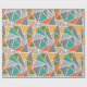Dieses Papier hat ein modernes Design von Dreiecken, das den Terrazzo-Boden in Grautönen, Türkis, Orange, Gold und Grün aussieht.