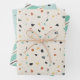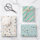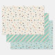Das Sortiment an Verpackungspapier besteht aus Terrazo-Fliesen, inspirierte Geschenkverpackung in Creme und Blassgrün, sowie einem Umhüllungspapier mit einem abgestimmten Muster von Diagonalstreifen.