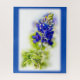 Ein Grafik-Print einer Bluebonnet-Blume, Stamm und Blätter, umgeben auf einem weißen Hintergrund mit einer Bluebonnet blauen Vignette.