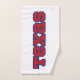 Cette serviette personnalisée à main est décorée d'un design qui affiche le mot "Texas" dans une police d'impression Sports World avec des lettres rouges bleu contour dans ce style et thème de fierté d'état personnalisé. Cette serviette est faite avec un avant de mélange polyester tandis que le dos est 100% coton toutes les serviettes utiliseront sublimation/impression vibrante qui est conçu pour dernier.