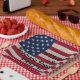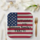 US Patriotic American Flag auf einem simulierten Leinenstoff mit US Flagge, rot-weiß-blau, und Text. Der kalligrafische Text ist anpassbar.