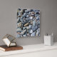 Die rustikalen Textziffern werden playfully auf die Kiesel im Fotodruck verteilt.