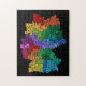 Eine typografische Textabbildung von Deutschland, hergestellt von den Namen der deutschen Regionen. Mehrfarbiger Text auf einem schwarzen Hintergrund.