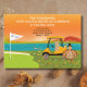 This festive moving announcement showcases a Thanksgiving golf cart on a golf course, loaded with moving boxes, with a Thanksgiving Turkey carrying one of the boxes, the most important one- the kitchen box! It's a unique and humorous design that's sure to bring a smile to your fellow golfers and friends when they get this new address change.
