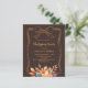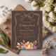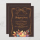 Une arrière - plan de couleur brun foncé. Décoré de feuilles de chute de couleur muette et d'un arc dessiné à la main. Personnalisez et ajoutez les détails de la fête. 1 feuille = 1 invite imprimé bord à bord.