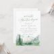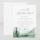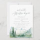 Watercolor lush green pine forest, teal river, and misty mountain with sage modern and so the adventure begins script, elegant and romantic, great invitation for boho rustic wedding and mountain forest destination wedding in spring and summer.