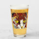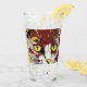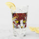 The drinking glass has a cat face on it a type of ed brown, black, yellow and a touch of a orange makes this glass bold and colorful.