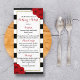 Die schicke, moderne Luxus-Hochzeitskollektion besticht durch einen klassischen schwarz-weißen Streifen-Hintergrund, der durch hübsche rubinfarbene rote Rosen und ein vergoldetes Imitat-Folienrahmen betont wird. Diese Menükarten sind einfach zu personalisieren und sind das perfekte Zubehör für jede Hochzeit, Brautparty, Geburtstagsfeier, Verlobung oder jeden anderen besondere Anlass.