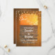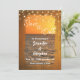 Une belle plage au coucher du soleil est encadrée par du bois rustique avec le reflet du coucher de soleil sur elle. Les lumières à cordes en haut fournissent une lueur supplémentaire. La typographie de script de brosse annonce Enregistrer la date. Les détails de la date du mariage à venir peuvent être facilement personnalisés.