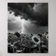This powerful black-and-white composition captures a moment of intense atmospheric tension over a vast field of sunflowers. In the foreground, the sunflowers are rendered in sharp detail, their petals glistening with raindrops as they bow slightly under the weight of a torrential downpour. The mid-ground features a jagged, multi-pronged lightning bolt that tears through the dark, heavy clouds, illuminating the horizon with a brilliant, white-hot glow. The high-contrast edit amplifies the texture of the rain streaks and the swirling, turbulent storm clouds, creating a cinematic and moody atmosphere that pits the delicate beauty of the flowers against the violent energy of the storm.