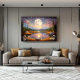 Contemplate the magic of a giant moon reflected in serene waters, surrounded by snow-capped mountains and a starry sky in pink and golden tones. This fantastic artwork transports you to an enchanted realm where dreams come true. Stunning digital art that brings peace, mystery, and cosmic beauty to your space.