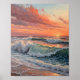 This image is a breathtaking seascape painting that captures the powerful and fleeting beauty of a sunset over a churning ocean. The composition is dominated by large, translucent waves crashing onto a sandy shore, with the light of the setting sun filtering through the crests to create a glowing emerald and gold effect. Above, a dramatic sky filled with voluminous, textured clouds is bathed in vibrant shades of coral, apricot, and soft violet. The brushwork is expressive and detailed, emphasizing the chaotic energy of the sea spray and the serene, expansive light of the horizon.