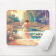 A pretty lady is in deep thought standing beside the lily pond, in a flowing gown.