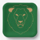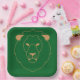 An expressive and elegant depiction of a lion's head, focusing on its regal symmetry and defining features. The artwork uses a stylized, flowing contour line for the main structure, complemented by filled-in details for the eyes, inner ears, and nose, evoking a sense of ancient heraldry. The gold-on-gray color scheme gives it a warm, premium, and sophisticated look.