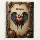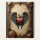 The pulsating heart of mechanics, a glowing steampunk heart. The frame features the characteristic steampunk style, characterized by a fascinating blend of Victorian elegance and industrial flair. Complex mechanical details such as intricate gears, screws, and bolts adorn the edge, lending depth and texture to the design. The heart is mechanically designed, with visible springs, small gears, and metallic embellishments that symbolize its vitality in a technical context. Flanking the heart are dark wings.