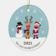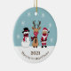 This funny and cute Christmas ornament has a snowman, reindeer and Santa Claus wearing masks. There are buffalo plaid patterns, and lovely red, white, black, and tan colors. You can customize it with the year.