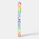 iPhone-Gehäuse mit feuertem Regenbogen-farbenem Muster theaterbezogener Ikonen auf weißem Hintergrund, mit aquafarbenen Drama-Masken in einem Kreis, in dem Sie einen Namen, Datum, Initialen, etc. hinzufügen können, um diesen Fall für Ihren Lieblings-Theater-Liebhaber zu personalisieren. Zu den Ikonen zählen: Shakespeare, Drama-Masken, Mikrofon, Musiknoten, Regisseursstuhl, Tickets, Sterne, Bühne-Vorhänge, Spotlight, Rose und vieles mehr.
