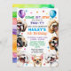 Invitation de chien Invitations de fête d'anniversaire. 5 ans (vous pouvez changer d'âge). Pour garçon ou fille. Jolie invitation à l'illustration de chiot souriante et joyeuse conçue avec des confettis et des ballons entourés de races de chiens populaires comme, shih tzu, carlin, maltese, chihuahua, poodle et beagle. Tout texte modifiable avec le nom de l'enfant, l'âge, l'heure de la fête, l'adresse et le RSVP. Vous pouvez changer l'image arrière en photo de votre enfant.