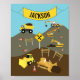 Illustration mignonne d'un chantier de construction et thème de camions. Les véhicules de transport de camions de construction comprennent le camion à benne, la pelleteuse, la rétrocaveuse, le bulldozer, la grue et le chargeur frontal. La conception parfaite pour les amateurs de camions, de machines lourdes garçons et filles. Cadeau de Noël idéal, cadeau d'anniversaire, décoration de nurserie, art pour chambre d'enfants, décoration intérieure ou rentrée scolaire. Personnalisez le nom et faites-en votre propre.
