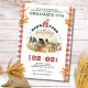Cette invitation présente une image délicieuse de foin empilé, d'adorables animaux de ferme, et est accompagnée d'autres illustrations liées à la ferme, créant une atmosphère de baryton dynamique. Coloré et doté d'une bordure ornée de charmantes cultures agricoles, il est l'invitation idéale à donner le ton pour une fête sur le thème de la ferme.