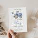Cette invitation d'anniversaire comporte un joli tracteur bleu avec des ballons colorés derrière, et le nom affiché en grandes lettres joyeuses. Il s'agit d'amusement et d'excitation pour le prochain panier d'anniversaire sur le thème du tracteur à la campagne!