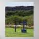 "Thingvellir Church Friedhof, Island" von Catherine Sherman. Kreuze markieren Gräber im Friedhof der Þingvellir (Thingvellir) Kirche in Þingvellir (Thingvellir) Nationalpark, Island. Jenseits liegt der Oxara River (Ax River) und ein langer Felsvorsprung, ein Teil des Wappen des Mittelatlantischen Rückens und die Grenze zwischen der nordamerikanischen tektonischen Platte und dem Eurasier. Þingvellir ist ein historisch, kulturell und geologisch bedeutsamer Ort und ist eines der beliebtesten touristischen Ziele in Island, etwa 40 km nordöstlich der isländischen Hauptstadt Reykjavík. Þingvellir ist der Nationalpark, in dem die Althing, eine Open-Air-Versammlung, die ganz Island repräsentiert, 1930 gegründet wurde und bis 1798 zusammentrat. Þingvellir bedeutet "Parlament-Ebenen". Die heutige Kirche in Þingvellir wurde 1859 geweiht, und 1907 wurde der Zauber wieder aufgebaut und verändert. Es gibt drei Glocken im Zauber, eine davon uralt, eine andere von Bischof Jón Vídalín, als er 1698 ordiniert wurde, und eine dritte Glocke, die 1944 in die Unabhängigkeit gebracht wurde. Þingvellir wurde 2004 zum UNESCO-Weltkulturerbe ernannt.
