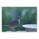 Gefangen genau im Moment etwas Tropfen des Wassers an seinem Publikum, Blicke dieses thrasher Vogels an Ihnen eines aufgerüttelten flüchtigen Blickes heraus umdrehen, offener noch den Mund aufsperrender Schnabel, sein Teller des weißen Wassers gerade vor ihm. Gegen einen unscharfen grünen Hintergrund ist dieser grau-unterstützte Vogel mit einem Stückchen von Weiß an seiner Kehle auf einer Felsenwand im Hinterhof meiner Schwester nahe Tucson, AZ stehend. Copyright Gail Storrs 2007.