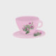 Original art by KG Nowak. Background is blush pink ombré with tea cup drawings. The tea cups are pink with roses and textural hand drawn details. The balloon is a light pink number three with a hand lettered “three” on the string.