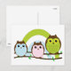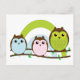 Drei niedliche Eulen, die auf einem Zweig sitzen, jede ein wenig anders groß und farbig.