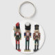 This double sided button keychain, zip pull, features three traditional Nutcrackers, one with a pair of cymbals, one with an axe and one with a sword against a white background. perfect as a gift or stocking filler.