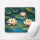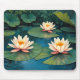 Three pink and white waterlilies and pads in an art nouveau style create a beautiful mouse pad.