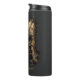 A stainless steel thermal tumbler featuring the dark 'Throne of Dust' design. An intricate clockwork throne made of gears, broken swords, and a golden mandala sits over faint occult symbols with black and gold grunge splatters. The text 'THRONE OF DUST' is at the bottom. Perfect for keeping drinks hot or cold. A great edgy, gothic, and heavy metal travel mug for daily commutes or dark fantasy fans.
