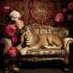 Inmitten der Pracht vergangener Zeiten erinnert ein regaler Löwe an ein antikes Sofa, das mit zarten rosa Blumen geschmückt ist. Die dunkelroten Damast-Wände umrahmen die Szene in einem Gefühl zeitlosen Luxus, während eine goldene Krone auf den Bestien ein stilles Zeugnis seiner noblen Herrschaft ablegt. In diesem Augenblick der Ruhe verflechten sich Power und Eleganz, um das Wesen eines Herrschers an der Erholung zu erfassen. Ideal für Kunstarbeiten oder Möbel.