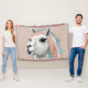 Dies ist eine digitale Abbildung des Kopfes eines Lamas auf einem rosa Hintergrund. Der Lama hat ein weißes Fell und eine blaue und rosa Kopfhaut, die ihm einen festlichen und zauberhaften Look verleiht. Die Illustration ist in einem flachen Design-Stil mit minimalistisch, die Schaffung einer modernen und einfachen Ästhetik.