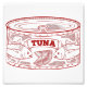 Ein Beispiel für eine Dose Thunfisch. Dieses Design ist rot-weiß und hat eine Thunfischdose mit zwei Fischen und einer Zitronenscheibe darauf. Gezeichnet im Stil eines Retro-oder Vintage Lebensmittel Werbung Poster.