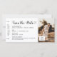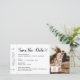Schwarz-Weiß-Silbergraue Hochzeitslogos auf einer lustigen und eleganten Boarding-Pass-Karte Save the Date für ein Reisethema oder eine Hochzeit in Urlaubsort, mit einem Foto und viel Platz für Reise- und Unterbringungsdetails. Die originalen Retro-Flugzeug-Ticketdetails beinhalten kleine Pfeile, Bar und Box für eine Sitzbelegung in einem Vintagen Schriftart. Hochzeiten in Urlaubsort benötigen alle Informationen über die Unterkunft vor einer Hochzeit. Wenn Sie bei der Erstellung der Reise- und Exkursionspläne gewollt haben, das Wort einfach herauszuholen, kann das Design auf der Rückseite gelöscht werden. Verwenden Sie dazu einfach den Template Editor für das Design Tool, um die gesamte Vorlage zu personalisieren. Paper Grape Destinations on Zazzle ist spezialisiert auf die Einladungen zum Thema Reisen und Hochzeitsstipendium für die Abenteurer, Wanderlust Pärchen planen ihre Hochzeit im Ausland.