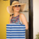 Tief blaue und weiße Cabana-Streifen Strandtuch