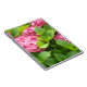 Atemberaubende, tiefrosa Hydrangeas in voller Blüte mit grünem Blattwerk.