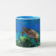 Schwimmen mit den exotischen tropischen Meeresschildkröten! Lebhaftes Foto erschossen Tauchen direkt unter der Oberfläche des blauen tropischen Meerwassers. Die Meeresschildkröten schwimmen um das Korallenriff herum und in der Nähe gibt es kleine, bunte tropische Fische. Meeresschildkröten können bis zu 100 Jahre leben, bis zu 5 Stunden lang unter Wasser halten, Quallen essen und bis zu 2.000 LBS wiegen.