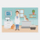 Desteis originelle niedliche Cartoon-Abbildung eines Tierarztes, der in einem Untersuchungsraum einer Tierklinik stehend ist. Der Tierarzt trägt einen weißen Labormantel, blaue Peelings und hat ein Stethoskop um den Hals. Der Tierarzt hat braunes Haar und einen lächelnden Gesichtsausdruck. Der Raum ist mit einem grauen Untersuchungstisch und einer weißen Kommode mit einem Bildschirm und einer Maus ausgestattet. An der Wand befinden sich zwei braune, schwimmende Regale mit einer grünen Pflanze und zwei kleinen, auf sie platzierten Medizingläsern. Es gibt auch ein Fenster und ein Röntgenbild des Skeletts eines Hundes und einiger Knochen. Auf dem Boden befindet sich ein tragbarer, beigefarbener Behälter für Heimtiere. Ein brauner und weißer Welpenhund sitzt auf dem Untersuchungstisch, während eine orangefarbene Katze auf dem Boden sitzt.