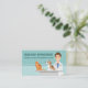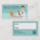 Desteis originelle niedliche Cartoon-Abbildung eines Tierarztes, der in einem Untersuchungsraum einer Tierklinik stehend ist. Der Tierarzt trägt einen weißen Labormantel, blaue Peelings und hat ein Stethoskop um den Hals. Der Tierarzt hat braunes Haar und einen lächelnden Gesichtsausdruck. Vor dem Tierarzt sitzen eine orangefarbene Katze und ein brauner und weißer Welpe auf einem grauen Untersuchungstisch. Personalisieren Sie die Textbereiche des Beispiels mit Ihrem benutzerdefinierten Text. Sie können entweder die Pfotendruck-Silhouette behalten oder sie durch das Firmenlogo ersetzen.