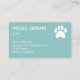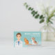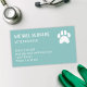 Desteis originelle niedliche Cartoon-Abbildung eines Tierarztes, der in einem Untersuchungsraum einer Tierklinik stehend ist. Der Tierarzt trägt einen weißen Labormantel, blaue Peelings und hat ein Stethoskop um den Hals. Der Tierarzt hat braune Haare und einen lächelnden Gesichtsausdruck. Neben dem Mann sitzt eine orangefarbene Katze und ein brauner und weißer Welpe auf einem grauen Untersuchungstisch. Auf der anderen Seite gibt es personalisierbare Textbereiche für Namen und Kontaktinformationen. Es gibt auch einen weißen Pfotenprint, der nach Wunsch durch ein benutzerdefiniertes Logo ersetzt werden kann.