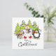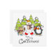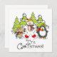 Eine niedliche, farbenfrohe Weihnachtsdesignkarte mit einem Eisbären, Pinguin und einer Maus mit Schals und eisbedeckten Skaten mit schneebedeckten Bäumen und Text, der lautet Weihnachten!