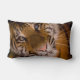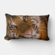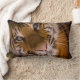 Naher Blick auf Tiger auf einem Lendenwirbel Kissen für Rückenlehne und Wohngestaltung. Eine große Katze liebt Kissen, um nachts zu träumen. Ein einzigartiges Kissen im Tiger-Akzent für die afrikanische Dekoration oder für die Dschungelsafari-Wohngestaltung.