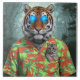Ein Tiger mit hawaiianischem Shirt und blauer Sonnenbrille hat ein graues Tabby in seiner vorderen Hosentasche.