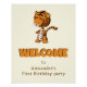 Adorable Dschungel Geburtstagswillkommenzeichen mit einer Abbildung eines niedlichen Tigers. Ideal für Ihr Kindergeburtstag Dekoration Party. Illustriert und entworfen von Patricia Alvarez.